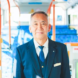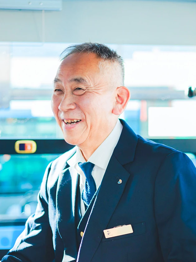 前職はトラック運転手。労働環境の改善を求めバス業界へ転身。入社後に幼少期の夢が運転士だったことがわかり、運命の導きを感じている。現在は班長運転士として後進育成などを担う。勤続20年を超える大ベテラン。