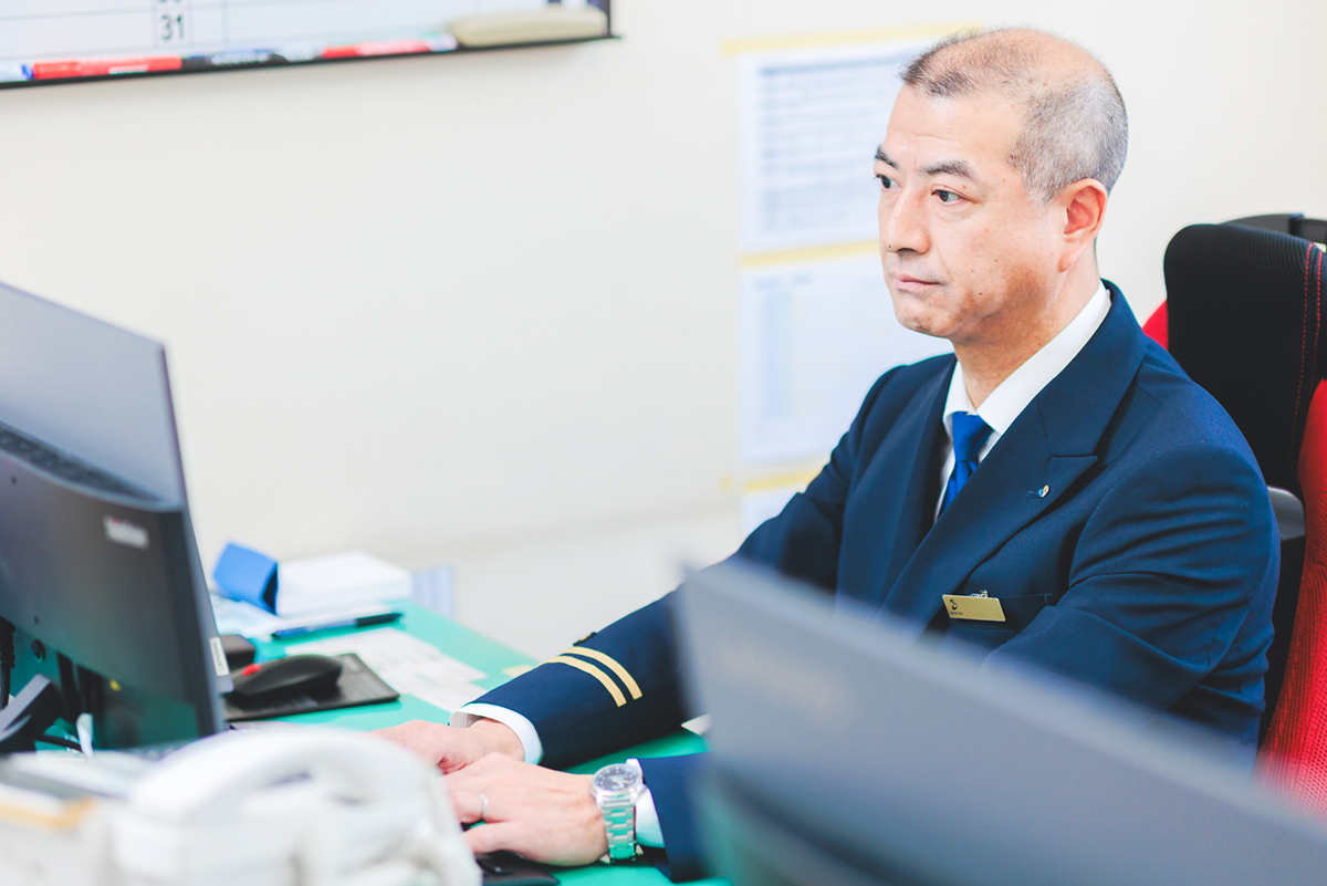 営業所全体の運営や労務管理を担っています。主にバス運行の安全確保、円滑なサービスの提供、社員の労務管理や指導・育成が中心です。特に大切なのが安全管理。事故を防止するため、車両点検や運転士の健康管理を徹底することに事務所全体で取り組んでいます。