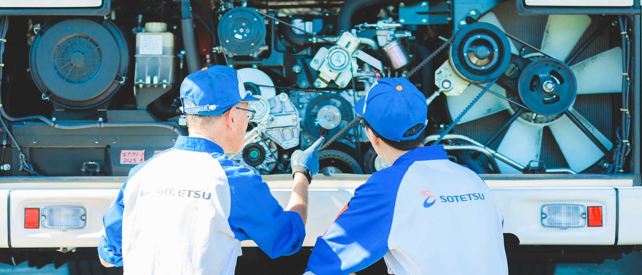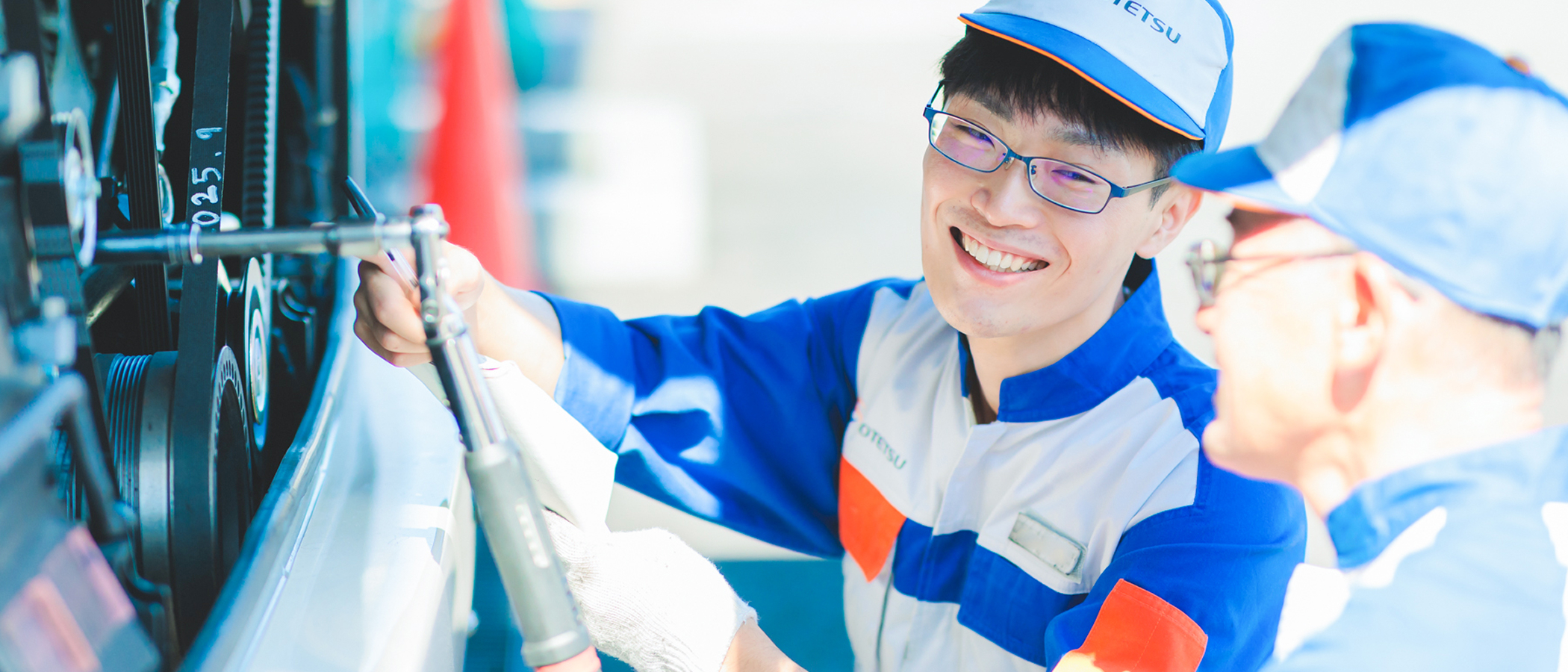 ひとり立ちしてすぐは、「1カ月点検」から始めました。エンジンルームを開け、打音の確認、目視点検、ベルトの張り具合の確認、あるいはお客様がふれる箇所に突起物がないかなど、安全輸送に必要な一連の作業を行う、基礎的な点検です。慣れてくると、次は「3カ月点検」や「6カ月点検」。これらは車体を上げて行うもので、点検項目はより多く、知識もいっそう求められます。現在は基本的に1日1台を整備し、加えて臨時修理にも対応します。臨時修理は綾瀬営業所の場合、週に3~4台ほど。例えば、運行中のライトの球切れや、クラッチの調整などに対応します。営業所で行うだけでなく、ときには現場に駆けつけることも。真夏の暑い日にクーラーのベルトが切れてしまい、2名体制で急行したこともありますよ。
