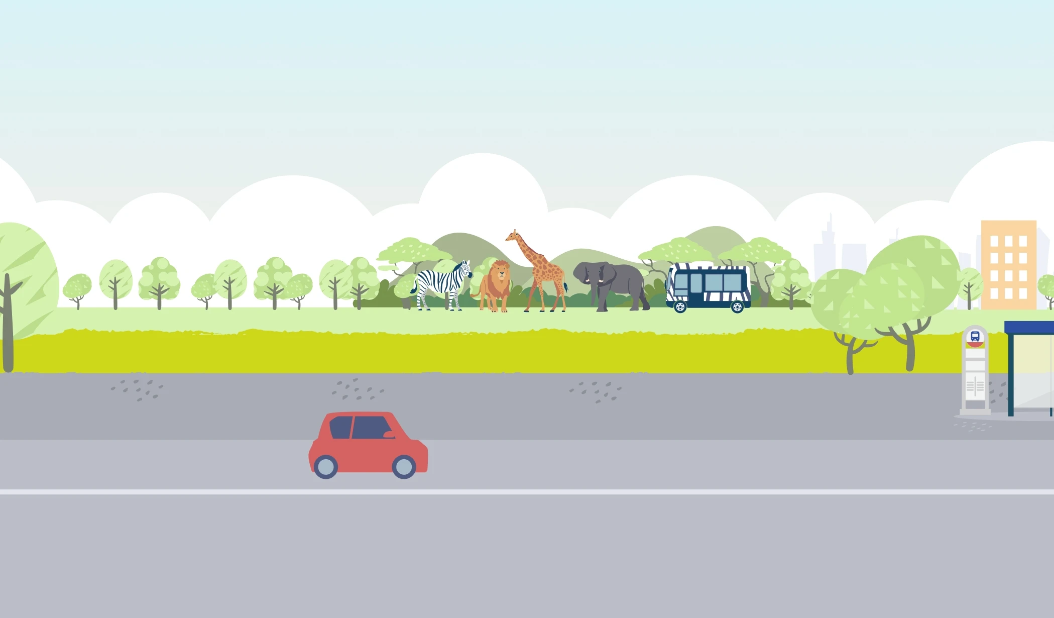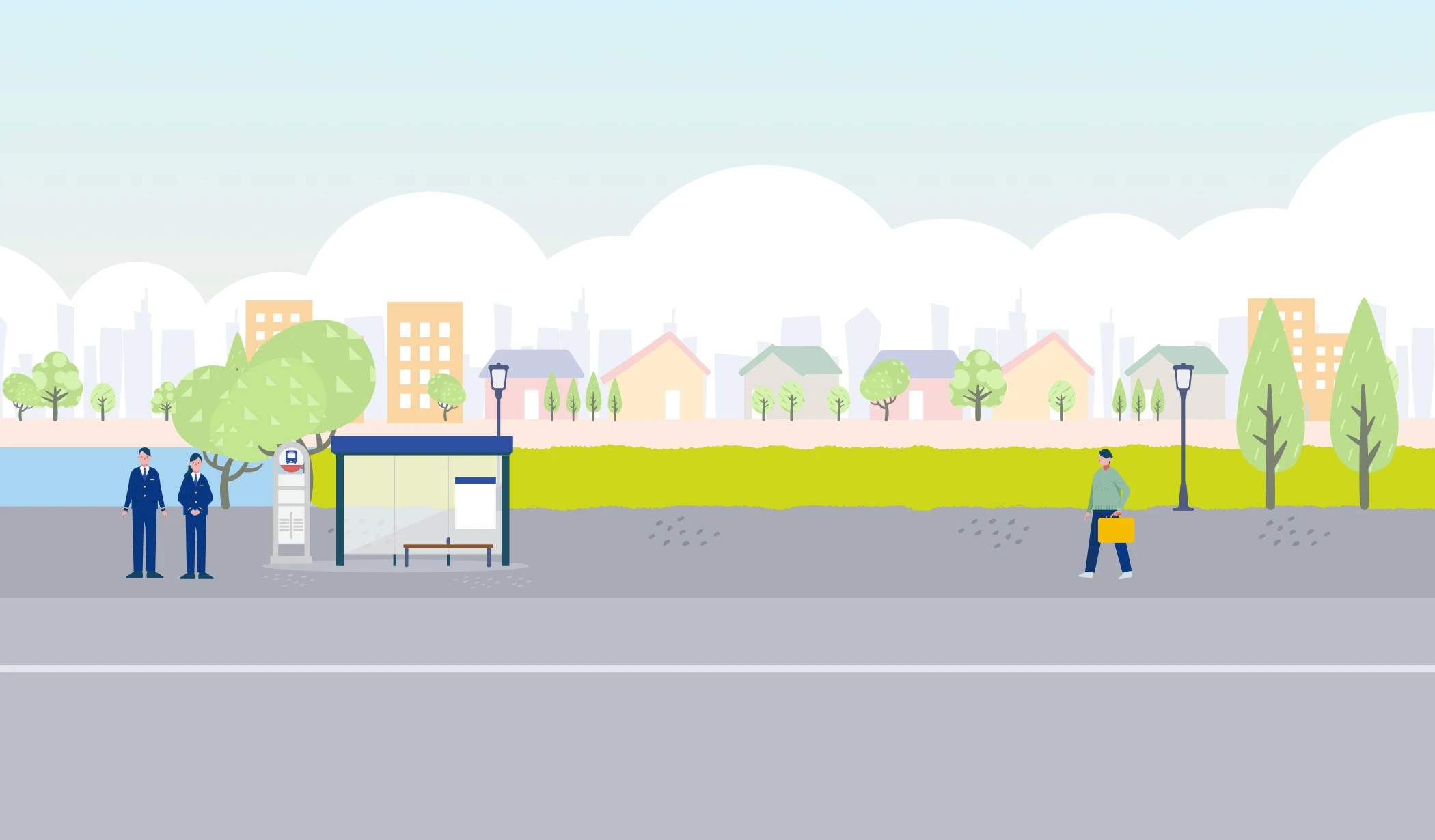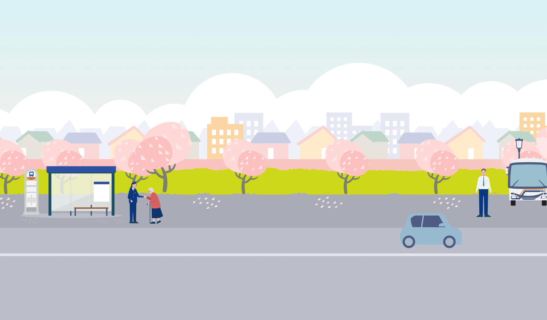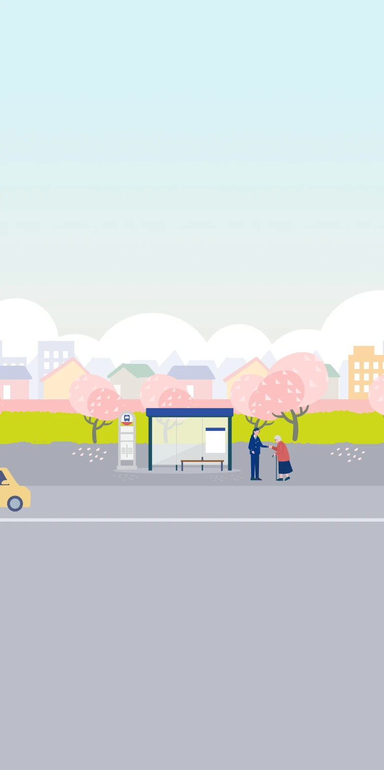 運転士の役割は、お客様を安全・安心な運転で目的地までお届けすること。事前に決められた「帯」と呼ばれるシフトに基づいて、日々の出退勤時間を管理し、各ルートに沿ってバス停をまわります。何よりも大切なのは安全運転。それに加えて、誰にとってもやさしい接遇が欠かせません。バスを利用される方は多岐にわたり、中にはお身体の不自由な方や、バスの乗り方に不慣れな方も。そうした方々の乗車をサポートし、快適にご利用いただくのも運転士の大切な仕事です。